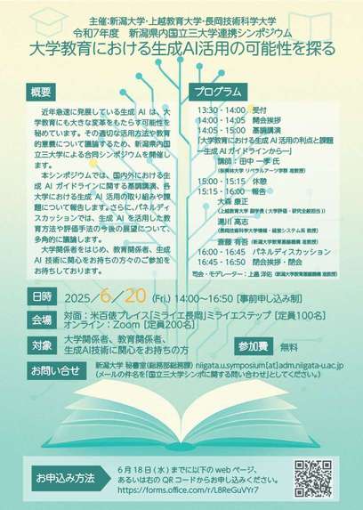 今年度は新潟大学を中心に企画され、6月20日(金)、「大学教育における生成AI活用の可能性を探る」をテーマに、シンポジウムとパネルディスカッションを、対面とオンラインを組み合わせたハイブリッド形式で開催しました。