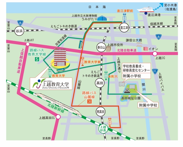 [バ ス]直江津駅北口の「直江津駅前」から「中央病院行き」又は「上越モール前行き」([5]教育大学線)乗車、「教育大学」下車(約20分)
